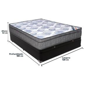 Base Box com Baú: Marca: KazaMix; Cor do Baú: Preto; Revestimento da Cama: Material Sintético; Material dos pés: Madeira; Estrutura: Madeira; Abertura: Pistão a gás; Peso máximo recomendado: até 150kg de cada lado; Altura do Baú: 32cm; Altura dos pés: 5cm; Altura total: 37cm; Garantia: 03 meses; Selo Ecologicamente Correto.