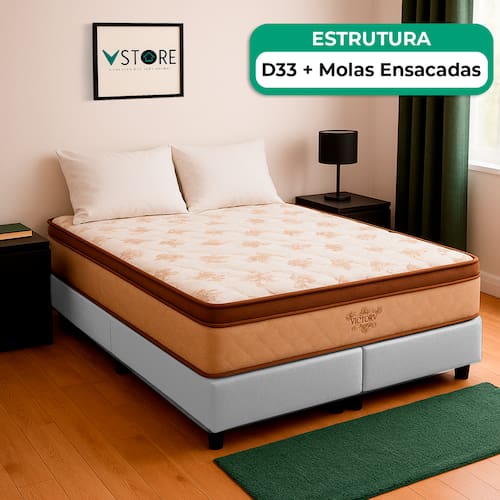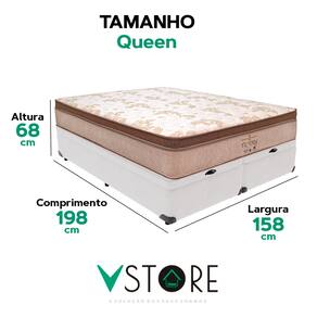 A tecnologia que a sua casa merece está na V-Store! O colchão Victory Solteiro da V-Store oferece noites de sono tranquilas e confortáveis, com seu toque macio e sistema de molas ensacadas que garantem suporte ideal e independência de movimentos. O Pillow Euro Pillow proporciona ainda mais suavidade, enquanto a tecnologia EPS adiciona resistência e durabilidade. Com proteções contra ácaros, fungos, mofo e alergias, ele garante um ambiente de sono saudável. Suporta até 150 kg por pessoa e tem garantia de 12 meses.A Base Box Baú Bravus da V-Store combina praticidade e sofisticação, com madeira reflorestada e revestimento sintético que facilitam a manutenção. Seu design otimiza o espaço de armazenamento e oferece resistência, suportando até 150 kg por pessoa. Com 44 cm de altura total e Selo Ecologicamente Correto, ela é ideal para quem busca sustentabilidade e qualidade. Transforme seu quarto com o colchão Victory e a Base Box Baú Bravus da V-Store!Característica Do Colchão: Modelo: VictoryMarca: V-StoreTamanho: QueenDimensões: 158x30x198 (Largura x Altura x Comprimento)Conforto: MédioSistema: Molas EnsacadasPillow: Euro PillowPeso Máximo recomendado: 150 kg (Por pessoa)Proteções: Antiácaro, antialérgico, antifungo, antimofoGarantia: 12 Meses (Espuma) / 10 anos ( Conjunto de Molas Ensacadas)Característica Da Base: Marca: V-StoreModelo: BravusCor do Box: BrancoTamanho: QueenDimensões: 158x44x198 (Largura x Altura x Comprimento)Estrutura: MadeiraPeso máximo recomendado: 150 kg (Por Pessoa)Altura do Box: 38 cmAltura dos Pés: 6 cmAltura total: 44 cmGarantia: 12 Meses (Estrutura) / 3 meses (Tecido)Selo Ecologicamente CorretoAtenção:- Antes de finalizar sua compra, recomendamos que verifique se as dimensões do produto são adequadas para serem transportadas pelos elevadores, portas, escadas e corredores de sua residência. Ressaltamos que não nos responsabilizamos pelo transporte do produto por meios específicos, como escadas, guinchos ou içamentos.- É possível que hajam leves variações de cor de acordo com o dispositivo que está sendo utilizado como smartphones, computadores, monitores e outros.