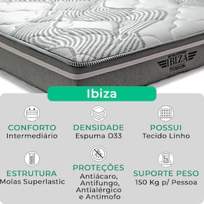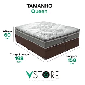 A tecnologia que a sua casa merece está na V-Store! O colchão Ibiza combina Molas Ensacadas, espuma de alta performance e sistema EPS, oferecendo suporte, conforto térmico e design moderno para noites revigorantes. Já a Base Box Baú Bravus une funcionalidade e elegância, com estrutura resistente, revestimento em tecido sintético e amplo espaço para armazenamento, ideal para otimizar o quarto com estilo..Característica Do Colchão: Modelo: IbizaMarca: V-StoreTamanho: QueenDimensões: 158x22x198 (Largura x Altura x Comprimento)Conforto: intermediárioSistema: Molas EnsacadasPillow: Não se aplicaPeso Máximo recomendado: 150 kg (Por pessoa)Proteções: Antiácaro, antialérgico, antifungo, antimofoGarantia: 12 Meses (Espuma) / 10 anos ( Conjunto de Molas Ensacadas)Característica Da Base: Marca: V-StoreModelo: BravusTamanho: QueenDimensões: 158x44x198 (Largura x Altura x Comprimento)Estrutura: MadeiraPeso máximo recomendado: 150 kg (Por Pessoa)Altura do Box: 38 cmAltura dos Pés: 6 cmAltura total: 44 cmGarantia: 12 Meses (Estrutura) / 3 meses (Tecido)Selo Ecologicamente CorretoAtenção:- Antes de finalizar sua compra, recomendamos que verifique se as dimensões do produto são adequadas para serem transportadas pelos elevadores, portas, escadas e corredores de sua residência. Ressaltamos que não nos responsabilizamos pelo transporte do produto por meios específicos, como escadas, guinchos ou içamentos.- É possível que hajam leves variações de cor de acordo com o dispositivo que está sendo utilizado como smartphones, computadores, monitores e outros.