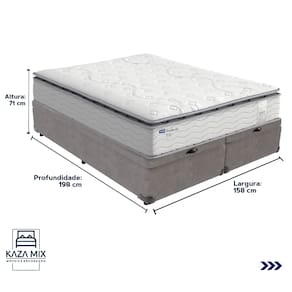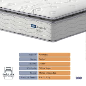 Bem-vindo(a) ao nosso catálogo!Apresentamos a você uma descrição completa sobre esse produto:O Colchão Amsterdã da Probel oferece o melhor em qualidade de sono. Com molas Prolastic e espuma de duas camadas (D33 e D65), proporciona um suporte firme e duradouro para um descanso revigorante. Seu Pillow Top Super adiciona um toque de luxo, enquanto suporta até 120kg de peso. Experimente conforto personalizado e uma postura correta durante o sono. Adquira o seu hoje e transforme suas noites em momentos de relaxamento incomparável.Colchão:Modelo: Amsterdã;Marca: Probel;Tamanho: Queen;Dimensões: 158x198x33cm; (largura x comprimento x altura)Conforto: Firme;Proteções: Antiácaro, antialérgico, antifungo, antimofo;Possui: Molas Prolastic;Pillow Top: Super;Camadas de Espuma: D33 e D65 Peso máximo recomendado: 120kg;Garantia: 03 meses;Base Box com Baú:Marca: KazaMix;Cor do Baú: Cinza;Material dos pés: Madeira;Estrutura: Madeira;Abertura: Pistão a gás;Peso máximo recomendado: até 150kg de cada lado;Altura do Baú: 32cm;Altura dos pés: 5cm;Altura total: 37cm;Garantia: 03 meses;Selo Ecologicamente Correto.Invista no seu sono e experimente o conforto e a qualidade!Atenção: Antes de finalizar sua compra, certifique-se de que as dimensões do produto sejam adequadas para serem transportadas pelos elevadores, portas, escadas e corredores de sua residência. Ressaltamos que não nos responsabilizamos pelo transporte do produto por meios específicos, como escadas, guinchos ou içamentos.