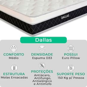 O Conjunto Colchão Dallas e Base Box Baú Bravus combina conforto e praticidade. O colchão, com molas ensacadas, espuma D33, Euro Pillow e tecnologia EPS, oferece suporte ideal, conforto térmico, maior durabilidade e resistência. A base box baú, com estrutura reforçada e acabamento elegante, proporciona amplo espaço para armazenamento e organização do dormitório. Perfeito para quem busca qualidade, funcionalidade e sofisticação.