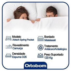 O Colchão De Molas Ensacadas AirTech Ortobom é indicado para pessoas de até 150kg proporcionando conforto firme, o que lhe confere firmeza suficiente para preservar sua coluna durante o sono sem comprometer seu conforto. Fabricado com matérias-primas de alta qualidade e durabilidade, o AirTech Molas Ensacadas Ortobom garante conforto e por muito mais tempo.
