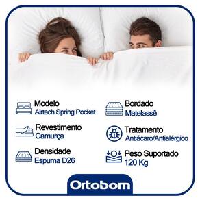 O Colchão De Molas Ensacadas AirTech Ortobom é indicado para pessoas de até 150kg proporcionando conforto firme, o que lhe confere firmeza suficiente para preservar sua coluna durante o sono sem comprometer seu conforto. Fabricado com matérias-primas de alta qualidade e durabilidade, o AirTech Molas Ensacadas Ortobom garante conforto e segurança por muito mais tempo.