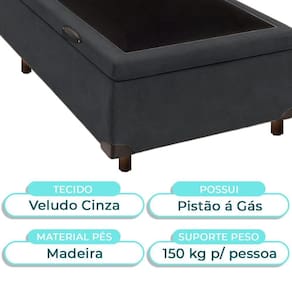 Modelo: Elite Marca: Nature Tamanho: Solteirão Tecido: Veludo Largura: 96cm Comprimento: 203cm Altura: 35cm Altura dos Pés: 7cm Material dos Pés: Madeira Suporte de Peso: 150Kg Peso: 25Kg Garantia: 3 Meses