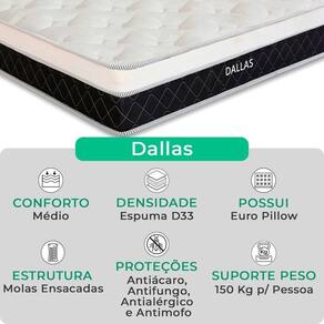O Conjunto Colchão Dallas e Base Box Baú Bravus combina conforto e praticidade. O colchão, com molas ensacadas, espuma D33, Euro Pillow e tecnologia EPS, oferece suporte ideal, conforto térmico, maior durabilidade e resistência. A base box baú, com estrutura reforçada e acabamento elegante, proporciona amplo espaço para armazenamento e organização do dormitório. Perfeito para quem busca qualidade, funcionalidade e sofisticação.