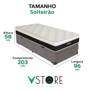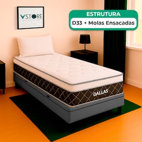 A tecnologia que a sua casa merece está na V-Store! O Conjunto Colchão Dallas e Base Box Baú Bravus combina conforto e praticidade. O colchão, com molas ensacadas, espuma D33, Euro Pillow e tecnologia EPS, oferece suporte ideal, conforto térmico, maior durabilidade e resistência. A base box baú, com estrutura reforçada e acabamento elegante, proporciona amplo espaço para armazenamento e organização do dormitório. Perfeito para quem busca qualidade, funcionalidade e sofisticação. Adquira agora e transforme suas noites de sono! Característica Do Colchão: Modelo: DallasMarca: V-StoreTamanho: SolteirãoDimensões: 96x20x203 (Largura x Altura x Comprimento)Conforto: MédioSistema: Molas EnsacadasPillow: Euro PillowPeso Máximo recomendado: 150 kg (Por pessoa)Proteções: Antiácaro, antialérgico, antifungo, antimofoGarantia: 12 Meses (Espuma) / 10 anos ( Conjunto de Molas Ensacadas)Característica Da Base: Marca: V-StoreModelo: BravusTamanho: SolteirãoDimensões: 96x44x203 (Largura x Altura x Comprimento)Estrutura: MadeiraPeso máximo recomendado: 150 kg (Por Pessoa)Altura do Box: 38 cmAltura dos Pés: 6 cmAltura total: 44 cmGarantia: 12 Meses (Estrutura) / 3 meses (Tecido)Selo Ecologicamente CorretoAtenção:- Antes de finalizar sua compra, recomendamos que verifique se as dimensões do produto são adequadas para serem transportadas pelos elevadores, portas, escadas e corredores de sua residência. Ressaltamos que não nos responsabilizamos pelo transporte do produto por meios específicos, como escadas, guinchos ou içamentos.- É possível que hajam leves variações de cor de acordo com o dispositivo que está sendo utilizado como smartphones, computadores, monitores e outros.