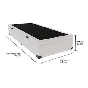 Marca: KazaMix Modelo: Baú Cor do Box: Branco Tamanho: Solteiro Dimensões: 88X188X37 (Largura x Comprimento x Altura) Estrutura: Madeira Peso máximo recomendado: 150 kg (Por Pessoa) Altura do Box: 32 cm Altura dos Pés: 5 cm Altura total: 37 cm Garantia: 03 meses Selo Ecologicamente Correto