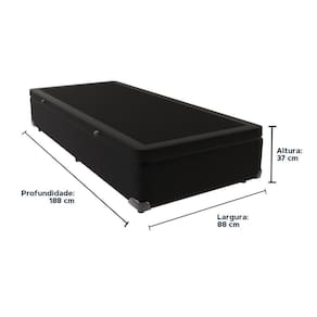 Marca: KazaMix Modelo: Baú Cor do Box: Preto Tamanho: Solteiro Dimensões: 88X188X37 (Largura x Comprimento x Altura) Estrutura: Madeira Peso máximo recomendado: 150 kg (Por Pessoa) Altura do Box: 32 cm Altura dos Pés: 5 cm Altura total: 37 cm Garantia: 03 meses Selo Ecologicamente Correto