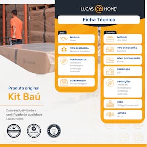 Especificações Técnicas Baú: - Marca: Lucas Home; - Material: Madeira tratada; - Peso máximo recomendado: até 150 Kg (por pessoa); - Altura do baú: 37cm; - Profundidade do baú: 27cm; - Altura dos pés: 5cm; - Revestimento da Cama: Material Sintético; - Garantia: 6 meses de garantia; - Dimensões do produto (largura x comprimento x altura) Solteiro: 88x188x42cm.