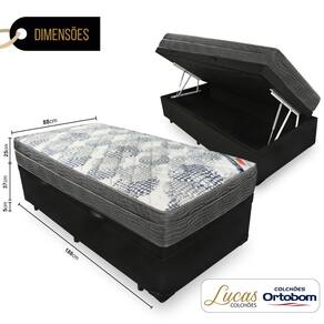 Especificações Técnicas Baú: - Marca: Lucas Colchões; - Material: Madeira tratada; - Peso máximo recomendado: até 150 Kg (por pessoa); - Altura do baú: 37cm; - Profundidade do baú: 27cm; - Altura dos pés: 5cm; - Revestimento: Material Sintético; - Garantia: 12 meses; - Dimensões do produto (largura x comprimento x altura) 88x188x42cm