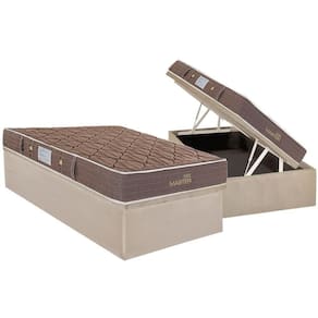 Estrutura interna do colchão: Molas Bonnel, espuma D18, Polyframe. Revestimento do colchão: Jacquard. Estrutura da base: Madeira. Revestimento da base: Tecido Suede Clean (Poliéster, Antiderrapante).