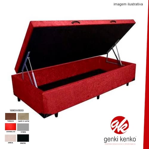 Produzida com madeira 100% reflorestada de eucalipto, a estrutura da cama box apresenta enchimento de espuma, enquanto o revestimento é feito com tecido Suede.