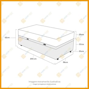 Especificações Técnicas Baú: - Marca: Lucas Home; - Material: Madeira tratada; - Peso máximo recomendado: até 150 Kg (por pessoa); - Altura do baú: 37cm; - Profundidade do baú: 25cm; - Altura dos pés: 5cm; - Revestimento da Cama: Material Sintético; - Garantia: 6 meses de garantia; - Dimensões do produto (largura x comprimento x altura) Solteiro King: 96x203x42cm.