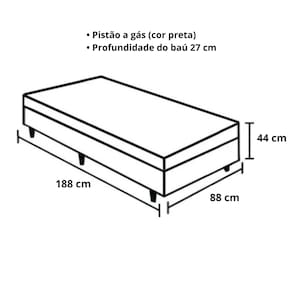 Cama Box Baú Solteiro O Box Baú Solteiro tem um sistema de fácil abertura por pistões a Gás com a medida de 188x88x44cm. Características: – Estrutura Externa: Linhão– Cor Predominante: Marrom– Material da estrutura: Madeira– Lateral da estrutura: Vazada– Altura do baú: 38 cm– Altura total do baú com pés: 44 cm– Largura: 88 cm– Comprimento: 188 cm– Profundidade Interna: 27 cm– Peso: 34 Kg– Altura dos Pés: 6 cm– Pistão a Gás: Sim, na cor preta– Tratamento Antiácaro: Sim– Tratamento Antialérgico: Sim– Suporta até (kg): 150 Kg– Garantia do Fornecedor: 03 meses– Necessita Montagem: Não– Acompanha colchão: Não– Acessórios: 2 puxadores e 1 arco na parte de trás para o colchão não escorregar Foto meramente ilustrativa.As cores podem variar de acordo com as luzes e tela do computador, celular etc.
