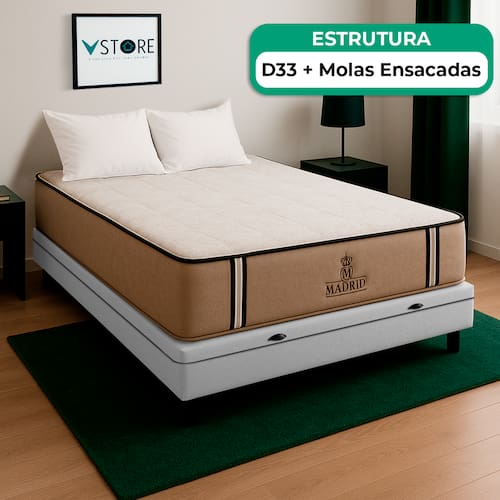 A tecnologia que a sua casa merece está na V-Store! O Conjunto Colchão Madrid + Base Box Baú Bravus da V-Store oferece o equilíbrio perfeito entre conforto, praticidade e elegância. O colchão, com molas ensacadas e sistema EPS, garante noites de sono tranquilas, com suporte ideal e proteção contra ácaros e alergias. Já a base box baú, feita com madeira reflorestada, conta com um design sofisticado, amplo espaço de armazenamento e funcionalidade adicional para guardar travesseiros, malas e cobertores. Com capacidade para até 150 kg por pessoa, esse conjunto é ideal para quem busca qualidade e praticidade.Característica Do Colchão: Modelo: MadridMarca: V-StoreTamanho: ViúvoDimensões: 128x28x188 (Largura x Altura x Comprimento)Conforto: MédioSistema: Molas EnsacadasPillow: Não se aplicaPeso Máximo recomendado: 150 kg (Por pessoa)Proteções: Antiácaro, antialérgico, antifungo, antimofoGarantia: 12 Meses (Espuma) / 10 anos ( Conjunto de Molas Ensacadas)Característica Da Base: Marca: V-StoreModelo: BravusTamanho: ViúvoDimensões: 128x44x188 (Largura x Altura x Comprimento)Estrutura: MadeiraPeso máximo recomendado: 150 kg (Por Pessoa)Altura do Box: 38 cmAltura dos Pés: 6 cmAltura total: 44 cmGarantia: 12 Meses (Estrutura) / 3 meses (Tecido)Selo Ecologicamente CorretoAtenção:- Antes de finalizar sua compra, recomendamos que verifique se as dimensões do produto são adequadas para serem transportadas pelos elevadores, portas, escadas e corredores de sua residência. Ressaltamos que não nos responsabilizamos pelo transporte do produto por meios específicos, como escadas, guinchos ou içamentos.- É possível que hajam leves variações de cor de acordo com o dispositivo que está sendo utilizado como smartphones, computadores, monitores e outros.