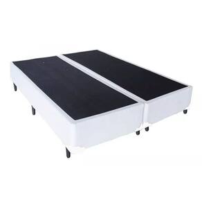 Base Cama Box fabricada com madeira reforçada 100% de reflorestamento, acabamento em tecido Corino Branco, tratamento antialérgico e antiácaro, pés em madeira, estrutura recomendada para até 110kg por pessoa.