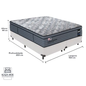 Bem-vindo(a) ao nosso catálogo! Apresentamos a você uma descrição completa sobre esse produto: A marca SealyEntre as personalidades que usam e usaram os colchões da marca Sealy estão a cantora Adele, Rainha Elizabeth II, a apresentadora Ellen DeGeneres e o jogador de basquete LeBron James. Atendendo também os hotéis da Disney, Copacabana Palace, Hard Rock Hotels e outros. Referência na fabricação de colchões de alta qualidade, a empresa foi fundada em 1881. Investindo em tecnologia de ponta e materiais premium para produzir produtos duráveis e confortáveis, é reconhecida por diversos consumidores famosos em todo o mundo. Modelo: CharlotteNível de Conforto: MacioSuporte de peso: 240 quilos (120kg por pessoa)Molas: Molas Ensacadas IndividualmentePillow: Pillow CloudEspuma: D33 e D28Altura: 34cmTecido: Tampo em Malha MarganTransforme suas noites de sono com Colchão Charlotte Sealy de 34cm, onde suavidade e suporte se encontram em perfeita harmonia. Com sua estrutura de Molas Ensacadas, ele se adapta às curvas do seu corpo, proporcionando um conforto macio e um suporte firme exatamente onde você precisa. Suportando até 240 kg, é durável e ideal para diferentes tipos de usuários. A tecnologia Posturepedic garante suporte extra nas áreas de maior pressão, ajudando a manter uma postura correta e promovendo um descanso profundo. As molas ensacadas individualmente trabalham de forma independente, minimizando a transferência de movimento e permitindo um sono tranquilo, mesmo que seu parceiro se mova durante a noite. O colchão é equipado com uma camada Pillow Cloud que intensifica a suavidade, e um tampo em malha Margan que regula a umidade e dissipa o calor, mantendo o colchão sempre fresco e confortável. A lateral em Jacquard Plano adiciona durabilidade e um toque de elegância ao colchão. Com fibras siliconadas e espumas variadas que aliviam a pressão e mantêm o suporte firme, o Colchão Charlotte Sealy é perfeito para uma noite de sono reparadora. Suas bordas firmes evitam o afundamento e ampliam a área útil do colchão, oferecendo mais espaço para relaxar. O Colchão Charlotte Sealy combina tecnologia avançada e um design inteligente, proporcionando uma experiência luxuosa de descanso. Transforme suas noites com um sono revitalizante e adquira o seu hoje mesmo! Além de tudo, esse produto acompanha a Cama Box da Kaza Mix e assim se torna um conjunto perfeito para o seu quarto! Marca: Kaza MixCor do Box: BrancoTamanho: KingMaterial dos pés: MadeiraEstrutura: MadeiraPeso máximo recomendado: Até 150kg de cada ladoLargura: 193cmComprimento: 203cmAltura dos pés: 12cmAltura total: 42cmGarantia: 03 mesesSelo Ecologicamente CorretoAtenção: - Antes de finalizar sua compra, recomendamos que verifique se as dimensões do produto são adequadas para serem transportadas pelos elevadores, portas, escadas e corredores de sua residência. Ressaltamos que não nos responsabilizamos pelo transporte do produto por meios específicos, como escadas, guinchos ou içamentos. - É possível que hajam leves variações de cor de acordo com o dispositivo que está sendo utilizado como smartphones, computadores, monitores e outros.