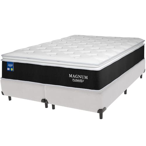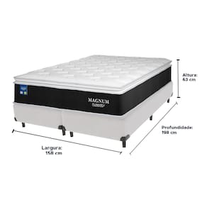 O conforto que sua casa precisa e a qualidade que você merece está na Kazamix!Descubra o colchão Magnum da Plumatex, a escolha ideal para quem busca conforto, suporte e qualidade. Com tecnologia avançada, o Magnum combina o melhor em materiais e design para proporcionar uma experiência de sono única.O colchão conta com uma camada de Malha Chronos 180 g/m², que oferece um toque macio e agradável. As Molas Ensacadas garantem suporte personalizado e distribuem o peso de forma uniforme, minimizando a transferência de movimento. A Espuma D26 oferece firmeza e conforto duradouro, enquanto o EPS Pillow Top Hig|h Tech adiciona um toque luxuoso, elevando ainda mais a experiência de descanso.Com proteção antiácaro, antialérgico e antifungo, o Magnum assegura um ambiente saudável para o seu sono. Ideal para quem deseja um colchão durável e de alta performance.Invista no seu bem-estar e experimente o conforto excepcional do Magnum.Modelo: MagnumMarca: PlumatexTamanho: QueenDimensões: 158x198X28 (Largura x Comprimento x Altura)Conforto: IntermediárioSistema: Molas EnsacadasPillow: Pillow TopPeso Máximo recomendado: 110 kg (Por pessoa)Proteções: Antiácaro, antialérgico, antifungo, antimofoGarantia: 1 ano pelo FabricanteO conforto que sua casa precisa e a qualidade que você merece está na Kazamix!Eleve o conforto e a sofisticação do seu quarto com a Cama Box!Produzida em madeira de reflorestamento reforçada, a Cama Box combina qualidade, durabilidade e um design elegante, que confere leveza e modernidade ao seu dormitório. Sua estrutura robusta suporta até 150 kg por pessoa, garantindo a sustentação perfeita para o colchão e prolongando a vida útil do produto.Com uma altura ergonômica, ela oferece maior conforto ao deitar e levantar, enquanto o acabamento de alta qualidade se adapta a qualquer estilo de decoração, unindo praticidade e estilo.Não perca tempo! Adquira agora mesmo a sua Cama Box e transforme seu dormitório com conforto e elegância.Marca: KazaMixModelo: BoxCor do Box: BrancoTamanho: QueenDimensões: 158X198X35 (Largura x Comprimento x Altura) Estrutura: MadeiraPeso máximo recomendado: 150 kg (Por Pessoa)Altura do Box: 25 cm Altura dos Pés: 10 cm Altura total: 35 cm Garantia: 03 mesesSelo Ecologicamente CorretoAtenção: Antes de finalizar sua compra, certifique-se de que as dimensões do produto sejam adequadas para serem transportadas pelos elevadores, portas, escadas e corredores de sua residência. Ressaltamos que não nos responsabilizamos pelo transporte do produto por meios específicos, como escadas, guinchos ou içamentos.