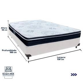 O conforto que sua casa precisa e a qualidade que você merece está na Kazamix!O Colchão Orthosono One Face une conforto firme e durabilidade com espuma D33 de alta qualidade. Com Euro Pillow, oferece uma camada extra de conforto para noites de sono ainda mais relaxantes. O revestimento em poliéster com bordado contínuo proporciona maciez e elegância, enquanto a tecnologia No Turn dispensa a necessidade de virar o colchão. Conta com base antiderrapante para maior estabilidade e tratamento antiácaro e antifungo, garantindo proteção contra alérgenos. Produzido com EPS, contribui para melhor isolamento térmico e maior leveza do produto. Certificado pelo INMETRO e fabricado com materiais sustentáveis, é a escolha ideal para quem busca qualidade e bem-estar.Modelo: Orthosono Marca: AnjosTamanho: CasalDimensões: 138x188X18 (Largura x Comprimento x Altura)Conforto: FirmeSistema: Espuma D33Pillow: Euro PillowPeso Máximo recomendado: 140 kg (Por pessoa)Proteções: Antiácaro, antialérgico, antifungo, antimofoGarantia: 1 ano pelo FabricanteO conforto que sua casa precisa e a qualidade que você merece está na Kazamix!Eleve o conforto e a sofisticação do seu quarto com a Cama Box!Produzida em madeira de reflorestamento reforçada, a Cama Box combina qualidade, durabilidade e um design elegante, que confere leveza e modernidade ao seu dormitório. Sua estrutura robusta suporta até 150 kg por pessoa, garantindo a sustentação perfeita para o colchão e prolongando a vida útil do produto.Com uma altura ergonômica, ela oferece maior conforto ao deitar e levantar, enquanto o acabamento de alta qualidade se adapta a qualquer estilo de decoração, unindo praticidade e estilo.Não perca tempo! Adquira agora mesmo a sua Cama Box e transforme seu dormitório com conforto e elegância.Marca: KazaMixModelo: BoxCor do Box: BrancoTamanho: CasalDimensões: 138X188X35 (Largura x Comprimento x Altura) Estrutura: MadeiraPeso máximo recomendado: 150 kg (Por Pessoa)Altura do Box: 25 cm Altura dos Pés: 10 cm Altura total: 35 cm Garantia: 03 mesesSelo Ecologicamente CorretoAtenção: Antes de finalizar sua compra, certifique-se de que as dimensões do produto sejam adequadas para serem transportadas pelos elevadores, portas, escadas e corredores de sua residência. Ressaltamos que não nos responsabilizamos pelo transporte do produto por meios específicos, como escadas, guinchos ou içamentos.