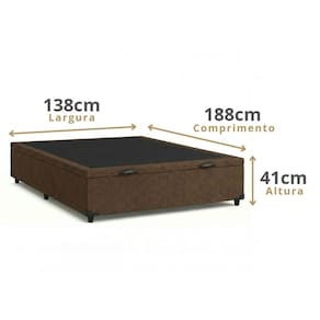 A Cama Box Bau é a escolha ideal para quem busca praticidade, conforto e um toque moderno no quarto. Com estrutura resistente em madeira de pinus, ela oferece durabilidade e segurança, além de um belo acabamento em tecido reforçado e nobre, fácil de limpar. Seu sistema de abertura fácil do baú permite um aproveitamento inteligente do espaço, mantendo tudo sempre organizado. Produto Montado: Não Acompanha Cama Auxiliar: Não Altura Máxima dos Pés: 6.0000 Ambiente Principal: Quarto Bicama: Não Cantoneiras: Sim codigo_ean: 7900288350060 Cor: Marrom Cor do Produto: Marrom Itens Inclusos: 1 Cama Box e Kit Ferragens Linha ou Coleção: Classic Marca: Beqaa Cama Box Material da Estrutura: Madeira Pinus Necessita Montagem: Não Origem do Produto: Nacional Peso: 84.2000 Possui Baú: Sim Recomendações de Uso, Manutenção e Limpeza: Não lavar, não usar produtos quimicos, somente um pano umido. Tamanho: Casal Marca: Não Informado