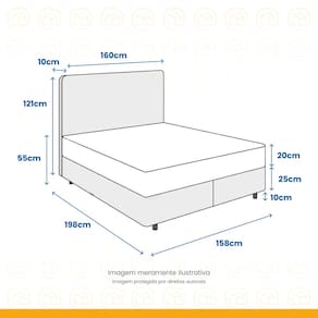 Especificações Técnicas Base Box: - Marca: Lucas Home; - Material: Madeira tratada; - Peso máximo recomendado: até 150Kg (por pessoa); - Altura da base: 25cm; - Altura dos pés: 10cm; - Revestimento: Corino; - Garantia: 06 meses na estrutura; - Dimensões do produto (largura x comprimento x altura) Queen: 158x198x35cm.