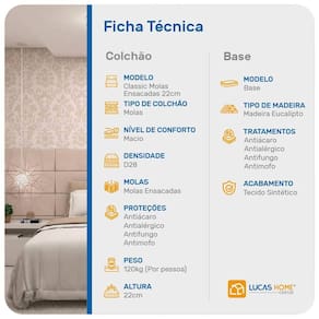 Sejam bem-vindos (as) a LUCAS HOME, garanta a qualidade que você merece,com sofisticação e organização em um só conjunto. A cabeceira Cassis é produzida com madeira de eucalipto e espuma D12. Possui um acabamento de alta qualidade deixando o seu ambiente mais sofisticado e despojado, dando aquele conforto na hora de ver filmes, séries e ler uma revista ou um bom livro. A base box é confeccionada com madeira de reflorestamento, tratamentos anticupim e antimofo. Seu revestimento de alta qualidade agrega valor e sofisticação ao quarto. O colchão de molas de fios contínuos Classic Superlastic proporciona conforto e maciez. O seu bordado em Matelassê te dá alívio extra na hora de deitar.