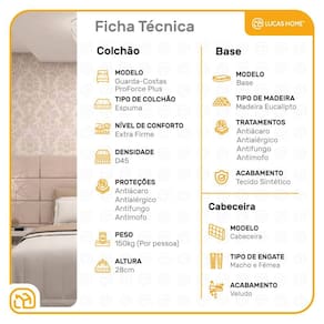A base box é confeccionada com madeira de reflorestamento, tratamentos anticupim e antimofo. Seu revestimento de alta qualidade agrega valor e sofisticação ao quarto.