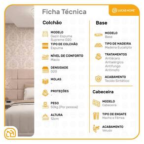 Sejam bem-vindos(as) a Lucas Home! Um conjunto primordial para seu quarto e um lugar de descanso pleno. A cabeceira Cassis é produzida com madeira de eucalipto e espuma D12. Possui um acabamento de alta qualidade deixando o seu ambiente mais sofisticado e despojado, dando aquele conforto na hora de ver filmes, séries e ler uma revista ou um bom livro. A base box é confeccionada com madeira de reflorestamento, tratamentos anticupim e antimofo. Seu revestimento de alta qualidade agrega valor e sofisticação ao quarto. O Colchão Supreme D20 é produzido em espuma D20 possuindo tecnologia Double face (você pode girar e virar, com isso a parte utilizada passa a descansar no período que não é utilizada). Suportando até 50kg (por pessoa) proporcionando conforto firme, o que lhe confere firmeza suficiente para preservar sua coluna durante o sono sem comprometer seu conforto.
