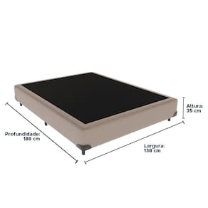 Marca: KazaMix Modelo: Box Cor do Box: Bege Tamanho: Casal Dimensões: 138X188X35 (Largura x Comprimento x Altura) Estrutura: Madeira Peso máximo recomendado: 150 kg (Por Pessoa) Altura do Box: 25 cm Altura dos Pés: 10 cm Altura total: 35 cm Garantia: 03 meses Selo Ecologicamente Correto