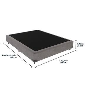 Marca: KazaMix Modelo: Box Cor do Box: Cinza Tamanho: Casal Dimensões: 138X188X35 (Largura x Comprimento x Altura) Estrutura: Madeira Peso máximo recomendado: 150 kg (Por Pessoa) Altura do Box: 25 cm Altura dos Pés: 10 cm Altura total: 35 cm Garantia: 03 meses Selo Ecologicamente Correto