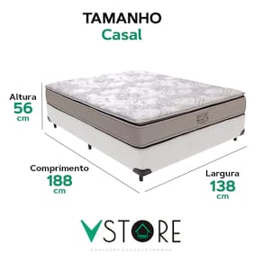 A tecnologia que a sua casa merece está na V-Store! O Conjunto Colchão Four Seasons e Base Box Bravus oferece o equilíbrio perfeito entre conforto e funcionalidade. O colchão, com molas ensacadas, pillow top e EPS, garante excelente suporte e conforto térmico, ideal para casais. Já a base, feita de madeira reflorestada e revestida em tecido sintético, oferece durabilidade e praticidade, com amplo espaço para armazenamento.Característica Do Colchão: Modelo: Four SeasonMarca: V-StoreTamanho: CasalDimensões: 138x30x188 (Largura x Altura x Comprimento)Conforto: MédioSistema: Molas EnsacadasPillow: Pillow TopPeso Máximo recomendado: 150 kg (Por pessoa)Proteções: Antiácaro, antialérgico, antifungo, antimofoGarantia: 12 Meses (Espuma) / 10 anos ( Conjunto de Molas Ensacadas)Característica Da Base: Marca: V-StoreModelo: BravusCor do Box: BrancoTamanho: CasalDimensões: 138x44x188 (Largura x Altura x Comprimento)Estrutura: MadeiraPeso máximo recomendado: 150 kg (Por Pessoa)Altura do Box: 26 cmAltura dos Pés: 6 cmAltura total: 44 cmGarantia: 12 Meses (Estrutura) / 3 meses (Tecido)Selo Ecologicamente CorretoAtenção:- Antes de finalizar sua compra, recomendamos que verifique se as dimensões do produto são adequadas para serem transportadas pelos elevadores, portas, escadas e corredores de sua residência. Ressaltamos que não nos responsabilizamos pelo transporte do produto por meios específicos, como escadas, guinchos ou içamentos.- É possível que hajam leves variações de cor de acordo com o dispositivo que está sendo utilizado como smartphones, computadores, monitores e outros.