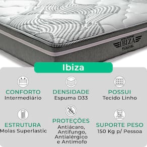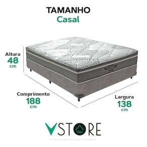 A tecnologia que a sua casa merece está na V-Store! O Conjunto Colchão Ibiza + Base Box Bravus Solteiro da V-Store é a escolha perfeita para quem busca conforto, durabilidade e elegância. O colchão, com Molas Ensacadas e espuma de alta performance, proporciona suporte ideal e conforto intermediário, além de ser protegido contra ácaros, fungos e alergias. A Base Box Bravus, fabricada em madeira reflorestada e revestida com tecido sintético, combina resistência, praticidade e um design sofisticado. Juntos, eles oferecem uma solução completa para transformar seu dormitório com qualidade e estilo. Característica Do Colchão: Modelo: IbizaMarca: V-StoreTamanho: CasalDimensões: 138x22x188 (Largura x Altura x Comprimento)Conforto: intermediárioSistema: Molas EnsacadasPillow: Não se aplicaPeso Máximo recomendado: 150 kg (Por pessoa)Proteções: Antiácaro, antialérgico, antifungo, antimofoGarantia: 12 Meses (Espuma) / 10 anos ( Conjunto de Molas Ensacadas)Característica Da Base: Marca: V-StoreModelo: BravusCor do Box: CinzaTamanho: CasalDimensões: 138x44x188 (Largura x Altura x Comprimento)Estrutura: MadeiraPeso máximo recomendado: 150 kg (Por Pessoa)Altura do Box: 26 cmAltura dos Pés: 6 cmAltura total: 44 cmGarantia: 12 Meses (Estrutura) / 3 meses (Tecido)Selo Ecologicamente CorretoAtenção:- Antes de finalizar sua compra, recomendamos que verifique se as dimensões do produto são adequadas para serem transportadas pelos elevadores, portas, escadas e corredores de sua residência. Ressaltamos que não nos responsabilizamos pelo transporte do produto por meios específicos, como escadas, guinchos ou içamentos.- É possível que hajam leves variações de cor de acordo com o dispositivo que está sendo utilizado como smartphones, computadores, monitores e outros.