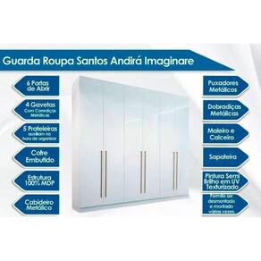 Dimensões(Cm): Comnto(Profundidade): 46,3cm x Largura: 238,8cm x Altura: 219cm Material de Estrutura - Estrutura 100% MDP Tipo de Pintura - Ultravioleta - Texturizada Tipo de Acabamento da Pintura - Semi Brilho Diferenciais Guarda Roupas - Calceiro - Sapateira - Maleiro Material dos Cabideiros - Cabideira Metálico Tipo de Dobradiças - Dobradiças Metálicas Diferenciais das Portas - Cofre Embutido Quantidade de Portas - 6 Portas de Abrir Tipo de Corrediça - c/ Corrediças Metálicas Quantidade de Gavetas - 4 Gavetas Quantidade de Prateleiras - 5 Montagem do Produto - Desmontável Garantia - 3 meses