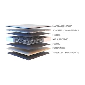 REVESTIMENTO INFERIOR: TNT Antiderrapante, Tecido 100% poliéster, com detalhes emborrachados. Evita que o colchão deslize sobre a base, trazendo maior segurança e conforto para o sono.