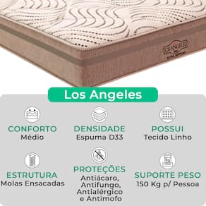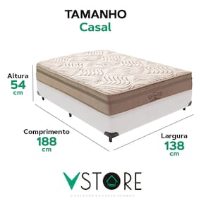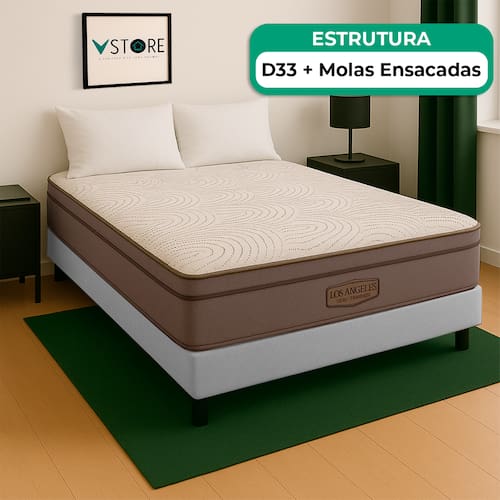 A tecnologia que a sua casa merece está na V-Store! O Conjunto Colchão Los Angeles + Base Box Baú Bravus da V-Store oferece conforto e funcionalidade. O colchão, com molas ensacadas e sistema EPS, garante suporte ideal, conforto térmico e proteção antiácaro. A base box, com amplo espaço de armazenamento, é feita de madeira reflorestada e revestida com tecido resistente, proporcionando praticidade e sofisticação ao seu quarto.Característica Do Colchão: Modelo: Los AngelesMarca: V-StoreTamanho: CasalDimensões: 138x28x188 (Largura x Altura x Comprimento)Conforto: MédioSistema: Molas EnsacadasPillow: Não se aplicaPeso Máximo recomendado: 150 kg (Por pessoa)Proteções: Antiácaro, antialérgico, antifungo, antimofoGarantia: 12 Meses (Espuma) / 10 anos ( Conjunto de Molas Ensacadas)Característica Da Base: Marca: V-StoreModelo: BravusTamanho: CasalDimensões: 138x44x188 (Largura x Altura x Comprimento)Estrutura: MadeiraPeso máximo recomendado: 150 kg (Por Pessoa)Altura do Box: 26 cmAltura dos Pés: 6 cmAltura total: 44 cmGarantia: 12 Meses (Estrutura) / 3 meses (Tecido)Selo Ecologicamente CorretoAtenção:- Antes de finalizar sua compra, recomendamos que verifique se as dimensões do produto são adequadas para serem transportadas pelos elevadores, portas, escadas e corredores de sua residência. Ressaltamos que não nos responsabilizamos pelo transporte do produto por meios específicos, como escadas, guinchos ou içamentos.- É possível que hajam leves variações de cor de acordo com o dispositivo que está sendo utilizado como smartphones, computadores, monitores e outros.