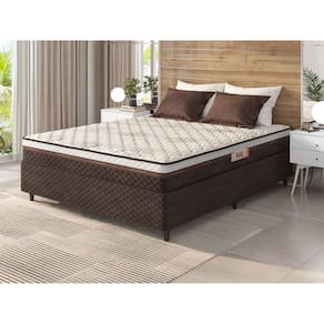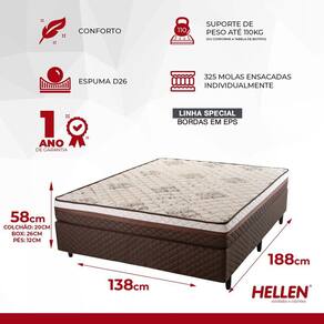 O colchão possui todos os requisitos que você procura para maior conforto e qualidade! Com molas Cervical ensacadas uma por uma, você não sentirá nenhum movimento externo, pois as molas são acionadas individualmente, diminuindo o atrito, o ruído, e garantindo maior sustentação e estabilidade. Abertura para Ventilação: Não Acompanha Cama Auxiliar: Não Acompanha Colchão: Sim Altura da Base Box (Sem o Colchão): 26 Altura do Colchão (Sem a Base Box): 20 Ambiente Principal: Quarto Antiácaro: Não Antialérgico: Não Antifungo: Não Cantoneiras: Sim Cor: Marrom Cor do Produto: Marrom Itens Inclusos: 1 Colchão, 01 Base Box, Kit Pés, Certificado de Garantia e Manual de Instruções Manual de Montagem e Instalação: https://product-hub-prd.madeiramadeira.com.br/816048/documents/a28f0d08-9bea-47c0-b9db-76930cc96c9e1113720manualpesboxhellen1.pdf Material da Estrutura: Eucalipto Material dos Pés: PVC Necessita Montagem: Não Nível de Conforto: Macio Origem do Produto: Nacional Permite a Utilização de Cama Auxiliar: Não Peso: 51.15 Possui Baú: Não Possui Pillow: Não Precisa virar: Não Recomendações de Uso, Manutenção e Limpeza: NAO Revestimento: Linho Revestimento da Base Box: Jacquard Tamanho: Casal Tamanho de Colchão: Casal Tipo do Colchão: Mola