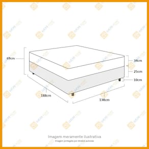 Especificações Técnicas Base Box: - Marca: Lucas Home; - Material: Madeira tratada; - Peso máximo recomendado: até 150Kg (por pessoa); - Altura da base: 25cm; - Altura dos pés: 10cm; - Revestimento: Material Sintético; - Garantia: 06 meses na estrutura; - Dimensões do produto (largura x comprimento x altura) Casal: 138x188x35cm.