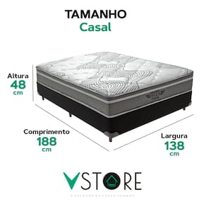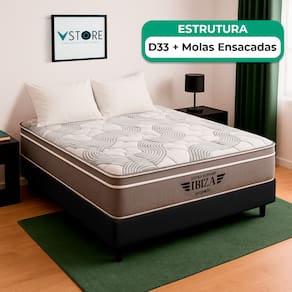 A tecnologia que a sua casa merece está na V-Store! O Conjunto Colchão Ibiza + Base Box Bravus Solteiro da V-Store é a escolha perfeita para quem busca conforto, durabilidade e elegância. O colchão, com Molas Ensacadas e espuma de alta performance, proporciona suporte ideal e conforto intermediário, além de ser protegido contra ácaros, fungos e alergias. A Base Box Bravus, fabricada em madeira reflorestada e revestida com tecido sintético, combina resistência, praticidade e um design sofisticado. Juntos, eles oferecem uma solução completa para transformar seu dormitório com qualidade e estilo. Característica Do Colchão: Modelo: IbizaMarca: V-StoreTamanho: CasalDimensões: 138x22x188 (Largura x Altura x Comprimento)Conforto: intermediárioSistema: Molas EnsacadasPillow: Não se aplicaPeso Máximo recomendado: 150 kg (Por pessoa)Proteções: Antiácaro, antialérgico, antifungo, antimofoGarantia: 12 Meses (Espuma) / 10 anos ( Conjunto de Molas Ensacadas)Característica Da Base: Marca: V-StoreModelo: BravusCor do Box: PretoTamanho: CasalDimensões: 138x44x188 (Largura x Altura x Comprimento)Estrutura: MadeiraPeso máximo recomendado: 150 kg (Por Pessoa)Altura do Box: 26 cmAltura dos Pés: 6 cmAltura total: 44 cmGarantia: 12 Meses (Estrutura) / 3 meses (Tecido)Selo Ecologicamente CorretoAtenção:- Antes de finalizar sua compra, recomendamos que verifique se as dimensões do produto são adequadas para serem transportadas pelos elevadores, portas, escadas e corredores de sua residência. Ressaltamos que não nos responsabilizamos pelo transporte do produto por meios específicos, como escadas, guinchos ou içamentos.- É possível que hajam leves variações de cor de acordo com o dispositivo que está sendo utilizado como smartphones, computadores, monitores e outros.