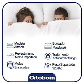 O Colchão De Molas Ensacadas AirTech Ortobom é indicado para pessoas de até 150kg proporcionando conforto firme, o que lhe confere firmeza suficiente para preservar sua coluna durante o sono sem comprometer seu conforto. Fabricado com matérias-primas de alta qualidade e durabilidade, o AirTech Molas Ensacadas Ortobom garante conforto e por muito mais tempo.