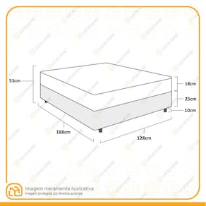 Especificações Técnicas Base Box: - Marca: Lucas Home; - Material: Madeira Tratada; - Peso máximo recomendado: até 100kg (por pessoa); - Altura da base: 25 cm; - Altura dos pés: 10 cm; - Revestimento da Cama: Material Sintético; - Garantia: 12 meses; - Dimensões do produto (largura x comprimento x altura): 128x188x35cm.