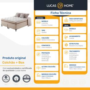 Sejam bem-vindos(as) a Lucas Home! Pensando em melhorar suas noites de sono?A cama Box + Colchão Classic Molas é a escolha ideal! Fabricado com matéria-prima de qualidade, ele suporta até 120kg por pessoa, proporcionando conforto médio, o que lhe confere conforto extra durante o sono sem comprometer sua coluna. A Cama Box é fabricada em madeira de reflorestamento, suporta até 100Kg e seus pés em madeira são de 12cm. Possui revestimento em suede nas laterais, o produto que faltava em seu dormitório.
