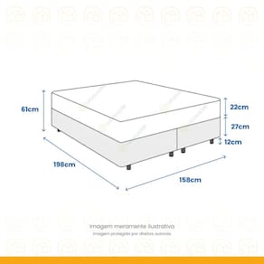 Especificações Técnicas Base Box: - Marca: Lucas Home; - Material: Madeira tratada; - Peso máximo recomendado: até 100Kg; - Altura da base: 27cm; - Altura dos pés: 12cm; - Revestimento Lateral: Suede; - Material dos Pés: Madeira; - Garantia: 12 meses; - Dimensões do produto (largura x comprimento x altura) 158x198x39cm;