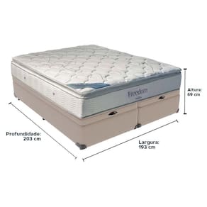 Colchão: Modelo: Freedom; Marca: Ortobom; Tamanho: King; Dimensões: 193x203x18cm; (largura x comprimento x altura) Conforto: Molas Ensacadas, Espuma Viscoelástica D33, Pillow Euro; Proteções: Antiácaro, antialérgico, antifungo, antimofo; Possui: Sistema No Turn; Peso máximo recomendado: até 150Kg; (por pessoa) Garantia: 03 meses;