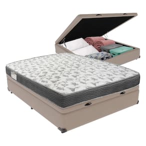 Base Box com Baú: Marca: KazaMix; Cor do Baú: Bege; Revestimento da Cama: Material Sintético; Material dos pés: Madeira; Estrutura: Madeira; Abertura: Pistão a gás; Peso máximo recomendado: até 150kg de cada lado; Altura do Baú: 32cm; Altura dos pés: 5cm; Altura total: 37cm; Garantia: 03 meses; Selo Ecologicamente Correto.