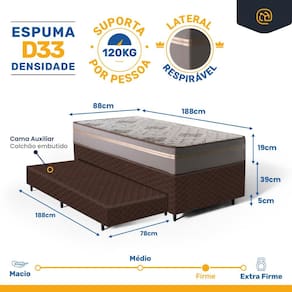 E sobre a base? Ela inclui uma cama auxiliar fixa com colchão de espuma, proporcionando um conforto firme e ortopédico para quem busca apoio adicional. Esta cama oferece fácil acesso e uma solução prática para quartos compactos, tornando-a uma escolha inteligente para quem valoriza conforto, suporte e otimização do espaço.