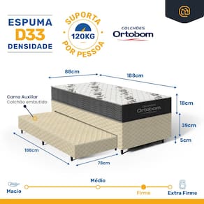 Precisa de um conjunto versátil e prático? Esta base fixa Bicama é acompanhado por um colchão auxiliar de espuma D28, proporcionando suporte firme e ortopédico para quem necessita de um descanso saudável. Este conjunto é a escolha perfeita para quem busca funcionalidade e suporte em uma única solução.