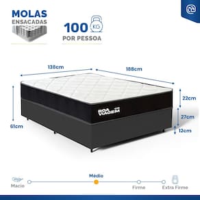 Complementando este colchão, a base box é feita de madeira tratada e revestida, suportando até 150 Kg por pessoa. Ela não só eleva seu colchão a uma altura ideal para fácil acesso, mas também estabiliza seu sono com uma fundação sólida e confiável. Esta combinação não apenas maximiza seu conforto, mas também a funcionalidade do seu espaço de descanso.