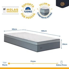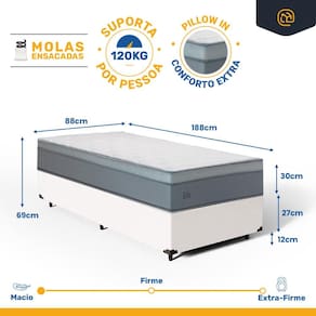 Deseja conforto extra e suporte individualizado? Nosso colchão com Molas Ensacadas e Pillow In oferece uma camada de conforto que se adapta ao seu corpo, aliviando pontos de pressão para um sono revigorante. Ideal para quem busca maciez e suporte duradouro, com capacidade para até 120 kg por pessoa.