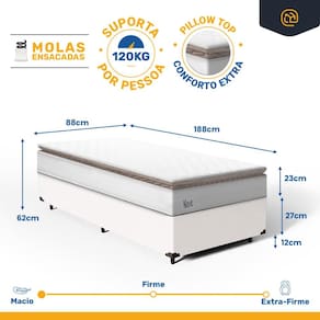 Complementando este colchão, a base box é feita de madeira tratada e revestida, suportando até 150 Kg por pessoa. Ela não só eleva seu colchão a uma altura ideal para fácil acesso, mas também estabiliza seu sono com uma fundação sólida e confiável. Esta combinação não apenas maximiza seu conforto, mas também a funcionalidade do seu espaço de descanso.