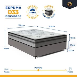 - Dimensões do produto (largura x comprimento x altura) Viúva: 128x188x35cm;